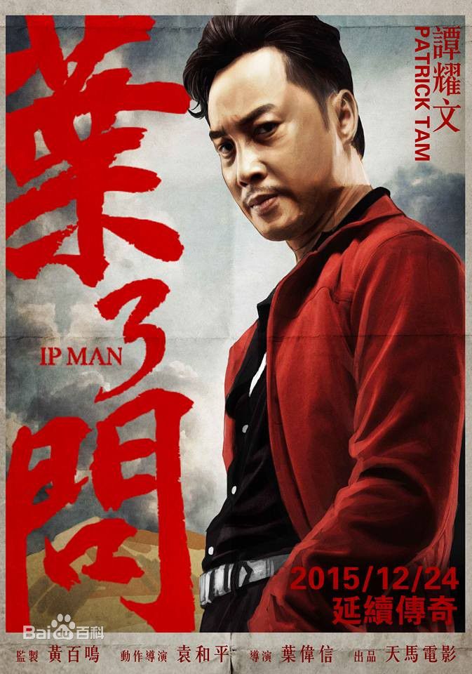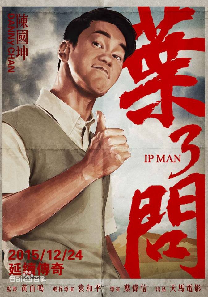 《叶问3》是《叶问》系列影片的第三部,是由东方电影制作有限公司、天马电影出品(香港)有限公司联合出品的功夫动作片,由叶伟信执导,甄子丹、熊黛林、张晋、谭耀文领衔主演 。 该片以叶问晚年为背景,讲述了一位豪杰落入种种困境后通过自强不息最终成为一代宗师的历程 。 影片于2015年12月24日在香港上映,并于2016年3月4日在中国内地上映 。