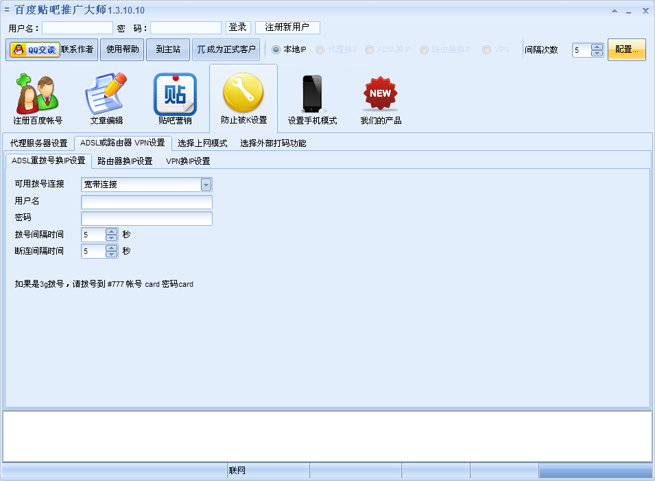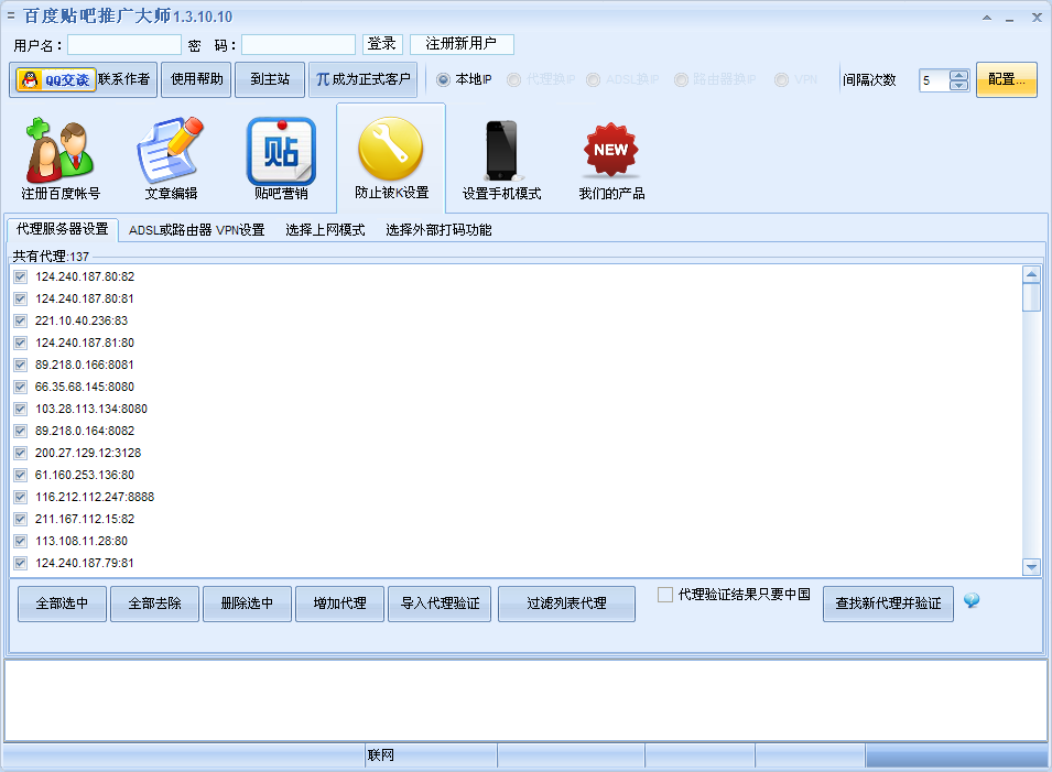 百度贴吧推广大师是一款全自动的百度贴吧推广工具,包含帐号注册、帐号激活、帖推广、文章伪原创、发帖回帖文章采集、发提升等级、回帖推广、关注喜欢贴吧等等不同功能。主动换ip,能使用代理模式、路由器换ip模式、adsl模式,操作简单,支持验证码识别,模拟手机贴吧等等功能。