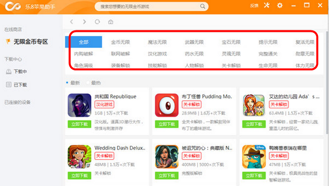 乐8苹果助手官网PC电脑版是一款运行在PC上面的苹果市场软件,该软件让用户一键安装游戏,非常简单快捷,想玩什么游戏,在这里都可以快速找到哦。平台,苹果助手采用了自主核心的应用技术,确保在使用下载、更新各种应用时,不会出现闪退、提示输入账号等情况,使用CDN加速,可在全国范围高速下载。