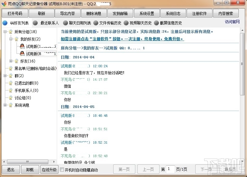 系人和黑名单好友的记录,消息组记录等。并支持多格式(.mht .txt)上传至指定邮箱功能。
