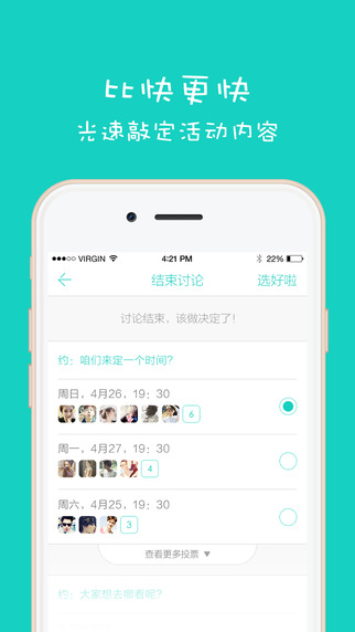 2、创新的「投票」模块,让时间、地点等聚会元素的讨论更方便;