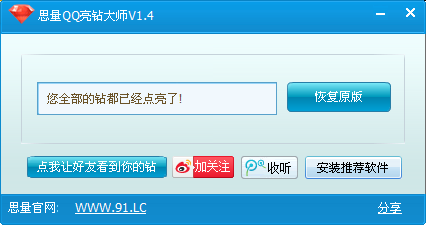 如果你更换QQ时,需重新启动“思量QQ亮钻大师”或者点击“恢复原版”按钮,再重新“点亮全部钻”。