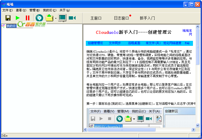 由组织者创建一个私有云,然后将相应的用户加入云中,用户即成为云成员;用户登录后,可以发现自己已经加入了这个云,在云内包含同步和云成员列表;同步,由云主指定同步云成员用户,每个云成员可以自己设定同步目录;每个云成员可以设置远程桌面接入,允许其他的云成员访问自己的电脑;云成员之间也可以快速传送文件,发送即时信息。