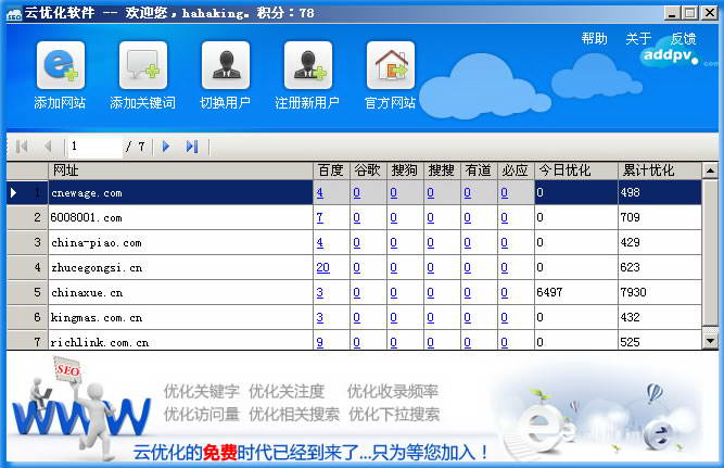 搜客云优化是一款采用全新智能云优化技术开发出来的一款搜索引擎关键词优化工具,能迅速在百度、谷歌、搜狗、搜搜、雅虎、有道、必应等搜索引擎中,依次进行目标网站的搜索,大幅度提高搜索引擎对网站的注重程度和关注度,提高网站在搜索引擎中的权重值。是一款SEO必备工具。