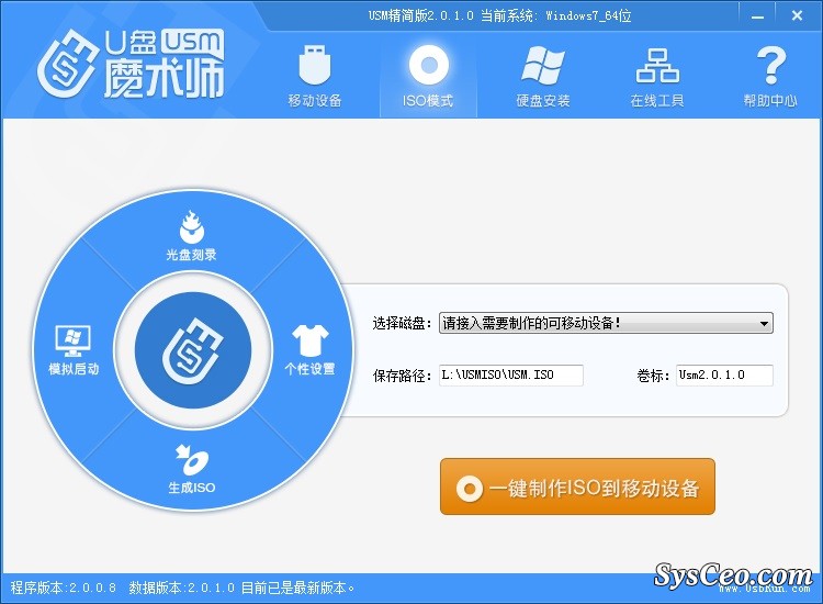 2、ISO模式:本页主要是对移动设备PE的ISO模式制作,提供的功能有:自动智能扫描并检测当前可用的移动设备、自定义制作参数、自定义PE菜单内容及PE系统壁纸等设置、模拟PE启动界面、刻录到光盘、一键全自动制作。