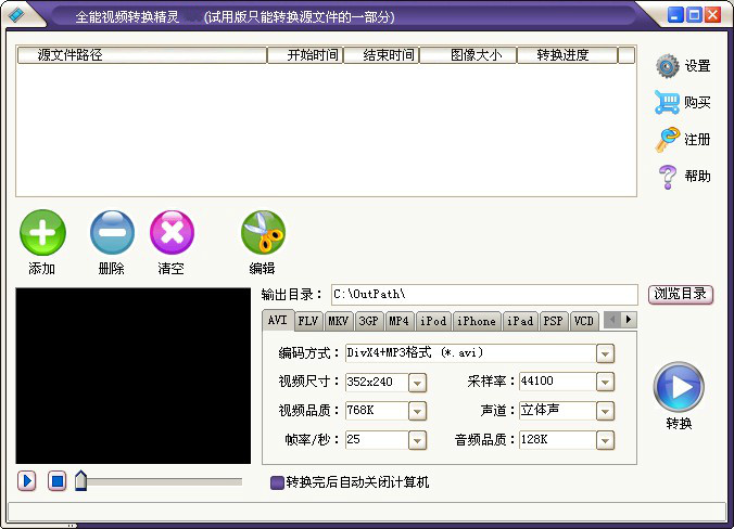 5、支持 MTS、M2TS、F4V、MOD、TOD、DV、H.264、NSV 等高清视频格式转换输出 3GP, 3G2, MPEG-4, H.264/AVC MP4, AVI, WMV, ASF, VCD, DVD, MPG, FLV, MKV 等格式