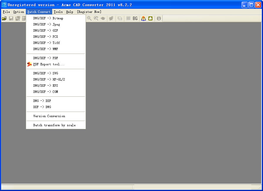 全能CAD版本转换器,专业的DWG图形文件转换和查看软件,支持DWG DXF DWF ( AutoCAD v2.x-2006)格式转换,输出矢量格式支持DWG, DXF, PDF, WMF, SVG, HPGL, PDF, CGM, EPS。输出光栅格式支持BMP, GIF, JPEG, PCX, TIFF, PNG, TGA,同时支持多个文件的格式批量转换。支持批量DWG / DXF文件修复和批量文件传输打包,你再也不用为拷贝给别人的文件不能正确显示文字而烦恼了。