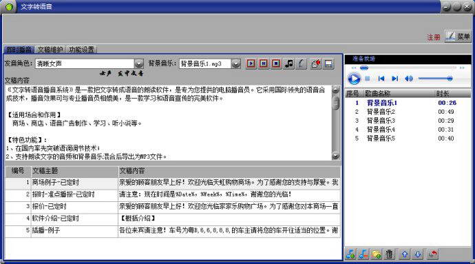 【简介】 《文字转语音播音系统》是一款把文字转成语音的朗读软件,是专为您提供的电脑播音员。它采用国际领先的语音合成技术,播音效果可与专业播音员相媲美,是一款学习和语音宣传的完美软件。