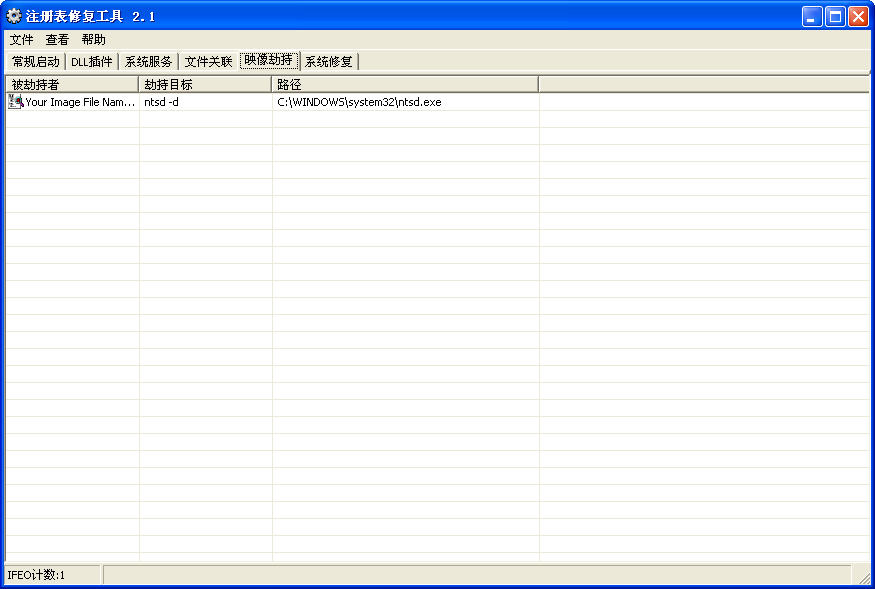 5.映像劫持,是指被拦截的程序,一般容易被病毒利用。默认有一项是以英文字母命名的,这个是安全的不需修复。