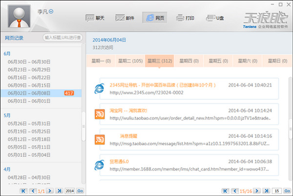 网页记录:详细记录网页浏览信息,如URL、网页标题、浏览时间等,支持关键字查询功能。
