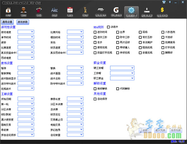 4、游戏设置:游戏性设置、教练设置、王朝设置、NBA规则、薪金设置、街球解锁、代码解锁、自动保存