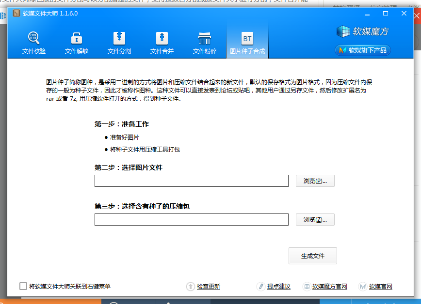 魔方文件大师拥有文件合并、文件校验、文件分割、文件解锁、文件粉碎及图片种子合并。其中图片种子合并能够降低图片储存空间,适合发到论坛帖子,合成只需三步。