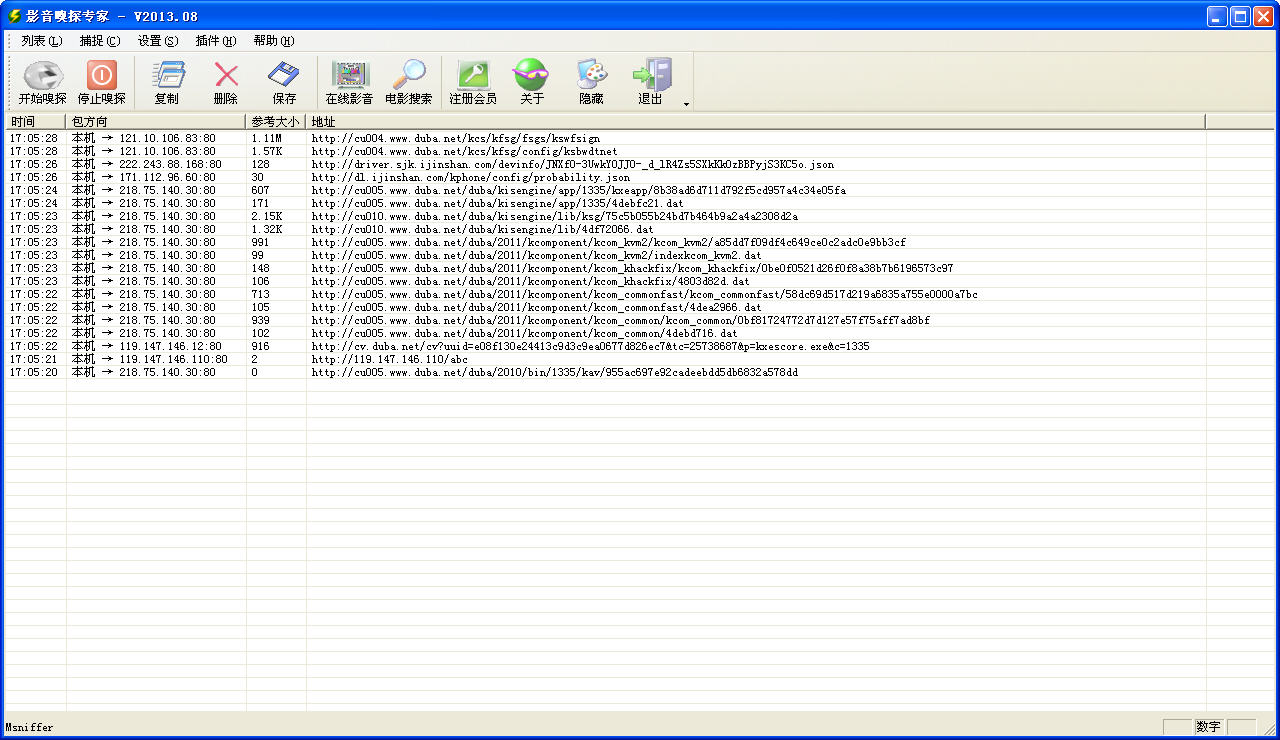 嗅探流经网卡及ADSL猫的网络包(与IE浏览器或realone, realplay, mediaplayer或暴风影音等播放器版本无关),无论其隐藏的多深,都能嗅探得到。