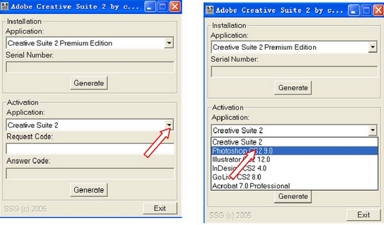 打开photoshop,选择电话激活,把第二段数字复制,打开注册机,在activetion中的phtoshop cs2 9.0在Request Code中粘贴,然后点击Generate,输入到phhotoshop就可以。