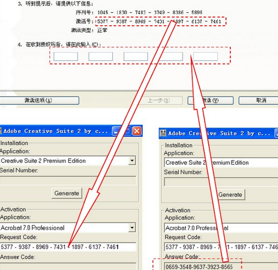 1、在断网的情况下,用序列号1045-1830-7483-3749-8386-5896进行安装。 2、安装过程中会弹出激活界面,这时请点击左下角的“激活选项”,接着选“通过软件自动激活系统进行电话激活”,点击“下一步”,记下激活号(共7组),然后运行注册机Keygen.exe,在“Activation Application”中选“Photoshop CS2 9.0”,在“Request Code:”中输入刚才所记下的激活号,按下最下面的“Generate”按纽,就可以得到授权码Answer code(共5组)。 3、返回Photoshop CS2激活界面,输入刚才生成的5组授权码,按“激活”,激活成功。 4、首次运行Photoshop CS2会要求进行网上注册,按下“不注册”即可。