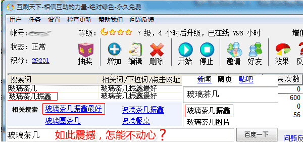 互刷天下是一款免费的网站关键词互刷工具,当您挂机运行软件时,软件会自动点击别人的任务。点击一次,您会得到1个积分。当您添加任务后(挂机运行的情况下时),您的任务会自动分配给其他用户去点击。被点击一次扣掉1个积分。