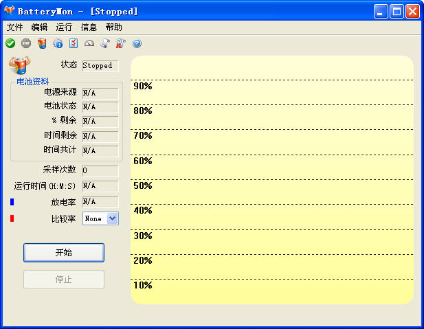 界面信息有电池状态、剩余百分比、运行时间、放电率等,有空的可以研究研究,简单粗暴型的直接看到左下的开始、结束两个按钮即可。
