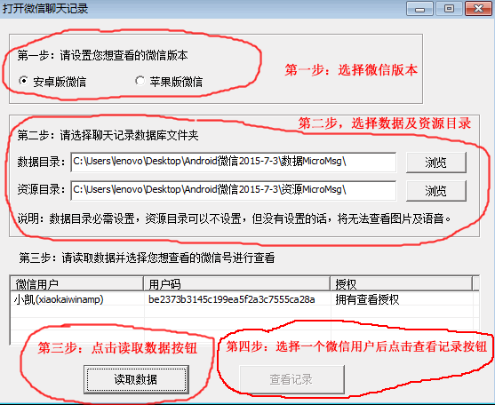 3、读取数据并选择想查看的微信号进行查看