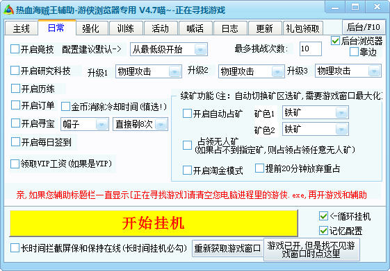 游侠热血海贼王辅助工具是一款关于页游《热血海贼王》的绿色辅助工具。辅助具有自动竞技 研究科技,开启历练,订单,自动占矿,寻宝。每日签到领工资等常用的功能。通过该辅助工具更加简单的进行游戏,帮助玩家节省时间和精力,做到事事快人一步。该软件的制作宗旨是简单游戏,带给玩家更好的游戏体验。
