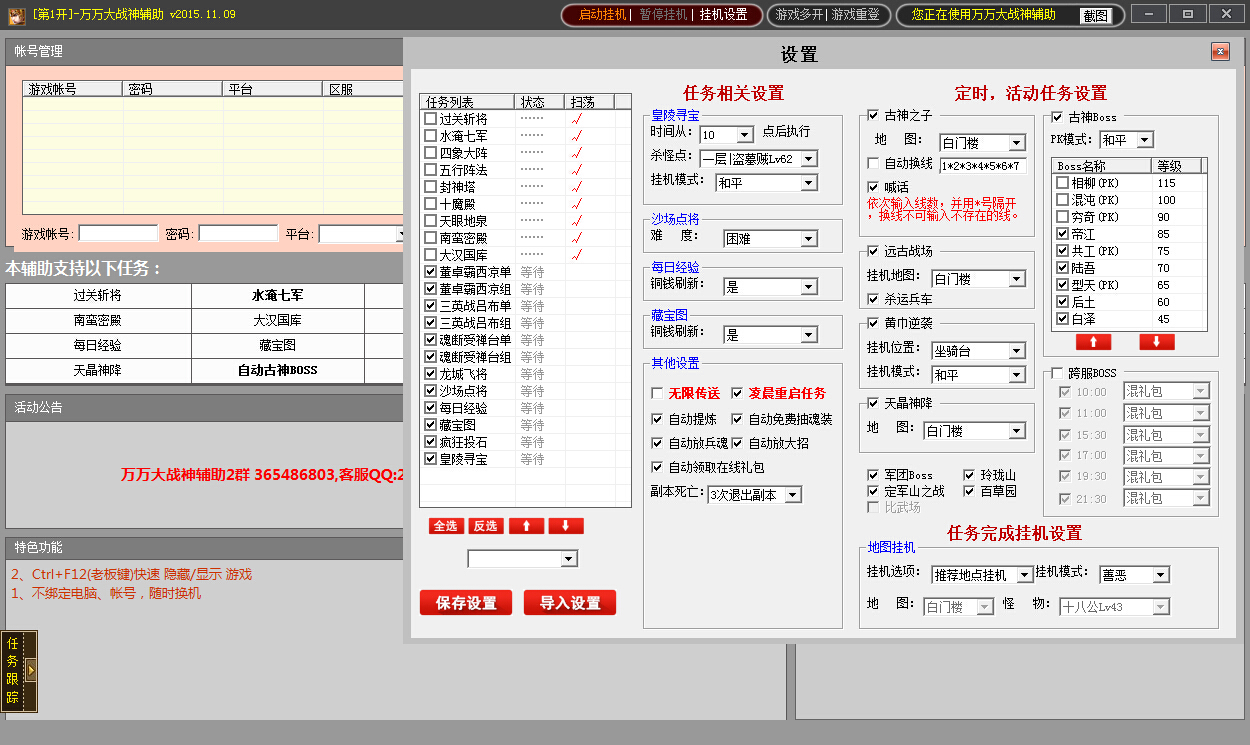 万万大战神辅助是唯一一款支持所有平台《大战神》游戏的超强智能挂机辅助软件,万万辅助首创了多平台、多账号自动登录、掉线百分百自动重连、无限多开、自动优化辅助CPU占用率等特色功能,深受广大大战神游戏玩家的肯定与支持,万万辅助支持自动每日任务等所有日常任务,古神BOSS、野外地图定点挂机、以及古神之子、百草园打儿子、跨服BOSS、自动放冰魂、放大招等超强功能,帮助各位玩家解放双手,快速提升,轻轻松松扫清升级道路上的一切障碍和困难。