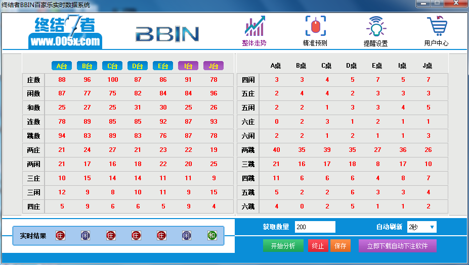 2016年最佳神器,BBIN结果实时数据分析系统。同步获取BBIN数据,可以通过本软件查看BBIN近期1-100000手数据的走向。同时分析每一桌的20种数据:庄闲和分布,连跳分布,两庄两闲,三庄三闲,两跳,三跳....等20种数据。