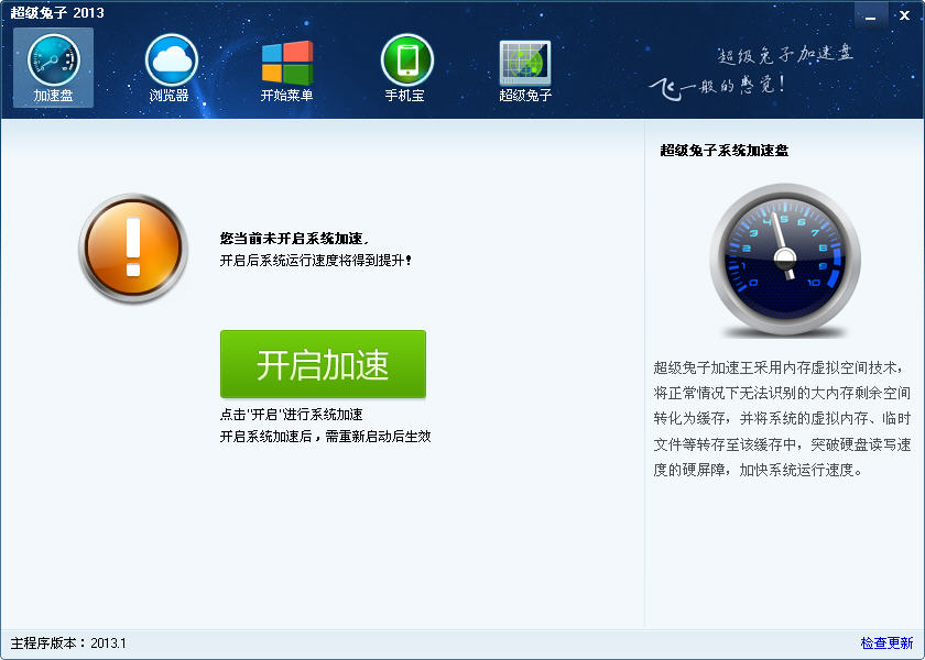 为了解决这问题,超级兔子加速器特别使用了内存虚拟空间技术,能够 将正常情况下无法识别的内存空间和系统使用不到的内存剩余空间转化为虚拟盘。并将系统的分页文件、临时文件、IE缓存等转存至内存虚拟盘中。突破硬盘读写速度的硬屏障,加快系统运行速度。