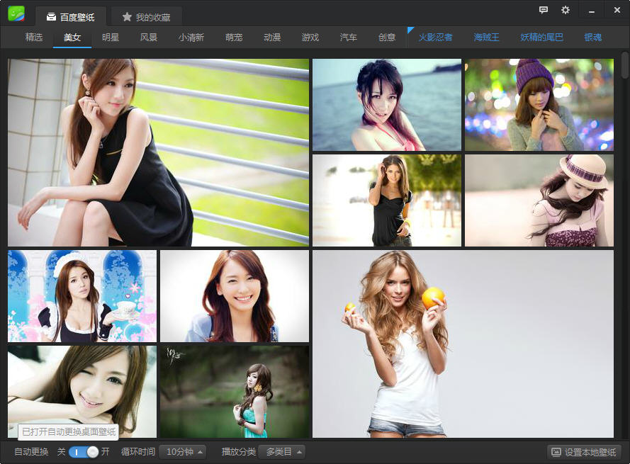 谁说壁纸一尘不变,谁说壁纸不尽人意,用百度壁纸,你可以从百万高清网络库中挑选你喜欢一批壁纸放入自己的分类目录进行轮播,随心情随主题,任你更换。